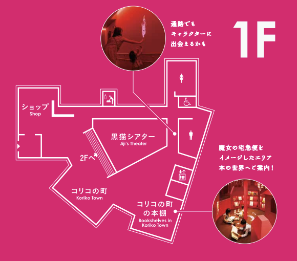 館内に足を踏み入れると、『魔女の宅急便』の舞台「コリコの町」をイメージしたいちご色の世界が広がり、代表作のキャラクターたちが登場するプロジェクションマッピングが壁一面に映し出されます。また、視覚トリックが楽しめる小窓など、子どもたちがワクワクする仕掛けがあふれています。