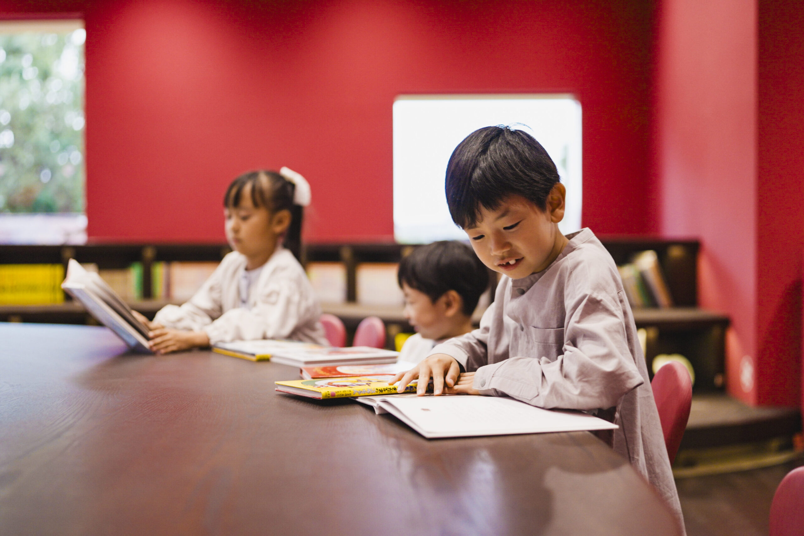 「おうち型」の本棚に囲まれたライブラリーには、角野栄子さんの著作はもちろんのこと、栄子さんが自ら選んだ世界の児童書や絵本が、子どもたちの自主性を活かすべくあえてあまり分類せずに配架されています。子どもたちは自由に本を選び、自分の好きな場所でゆっくりとお気に入りの本を読むことができます。