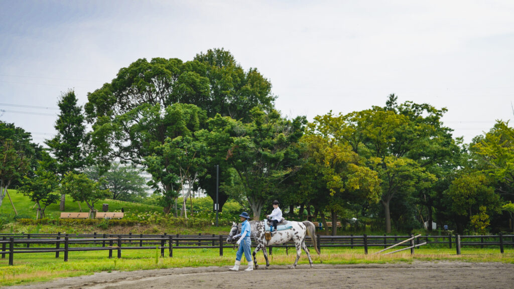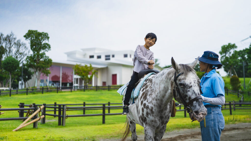 魔法の文学館は、なぎさ公園の小高い丘の上にあります。子どもたちは、緑豊かな公園で、お気に入りの本を読むことができます。なぎさ公園の一角には、小学6年生以下のお客様が無料でご利用いただけるなぎさポニーランドもあります。