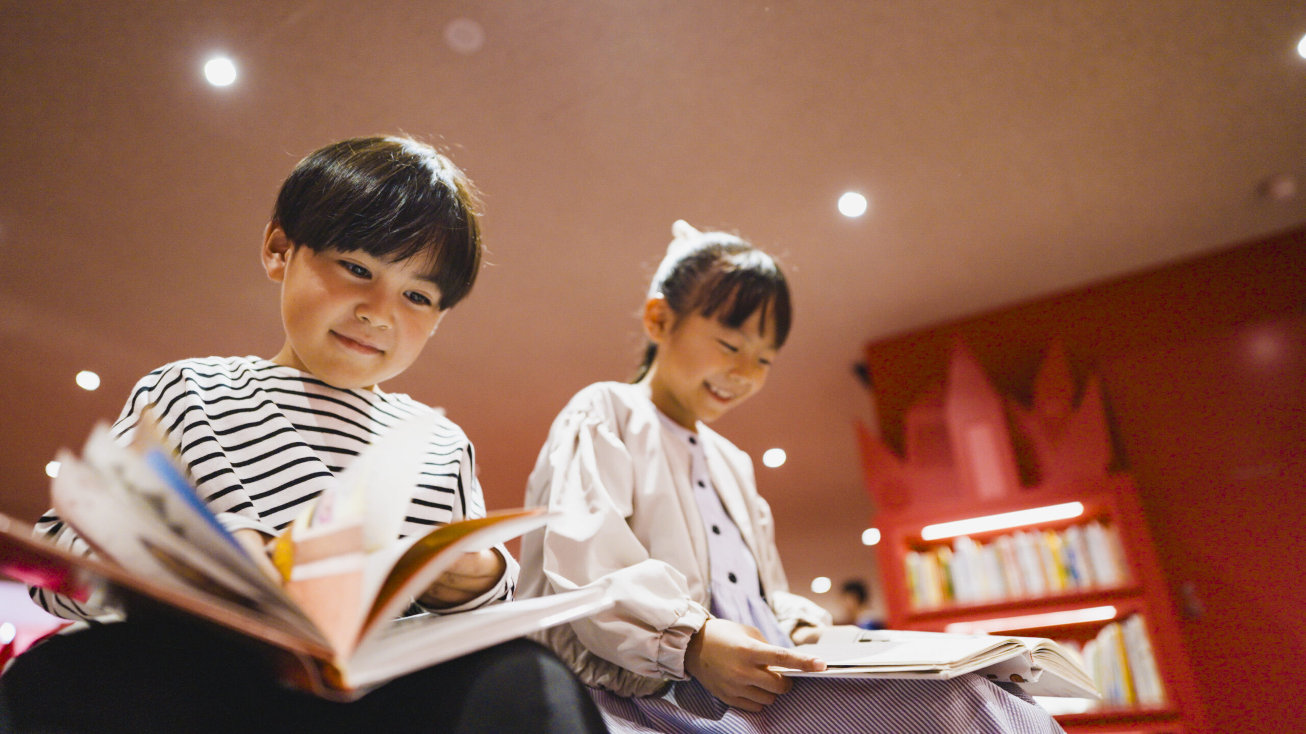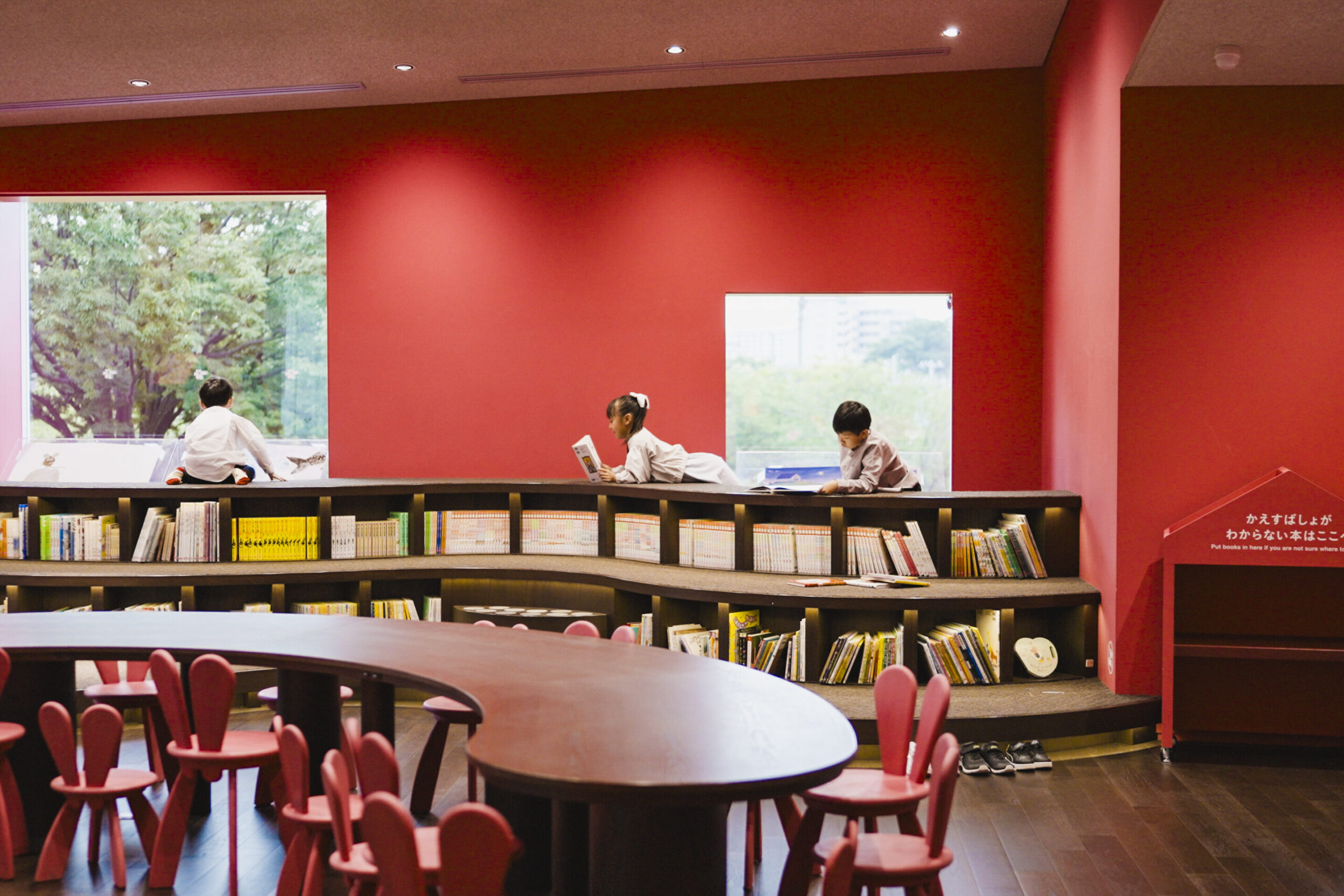 「おうち型」の本棚に囲まれたライブラリーには、角野栄子さんの著作はもちろんのこと、栄子さんが自ら選んだ世界の児童書や絵本が、子どもたちの自主性を活かすべくあえてあまり分類せずに配架されています。子どもたちは自由に本を選び、自分の好きな場所でゆっくりとお気に入りの本を読むことができます。