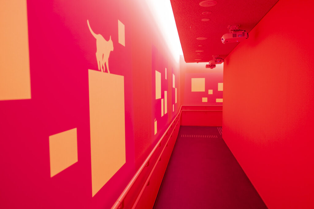 名前の由来は、もちろん『魔女の宅急便』の黒猫・ジジから。「いちご色」の通路には猫の鳴き声とともに足跡やシルエットが映し出され、まるで路地裏を一緒に散歩しているような雰囲気。「黒猫シアター」は、キャラクターとの会話が楽しめる、インタラクティブな映像プログラムによる参加型のシアターです。また、栄子さんの読み聞かせ映像は、子どもたちを物語の世界へといざないます。