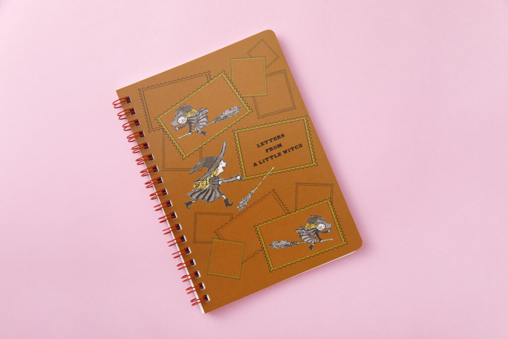 切手フレームのモチーフと飛ぶ魔女のコラージュがポイントで赤のリングがポイントになっています。中ページはシンプルなドット方眼の仕様です。