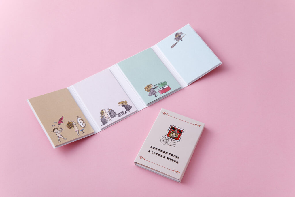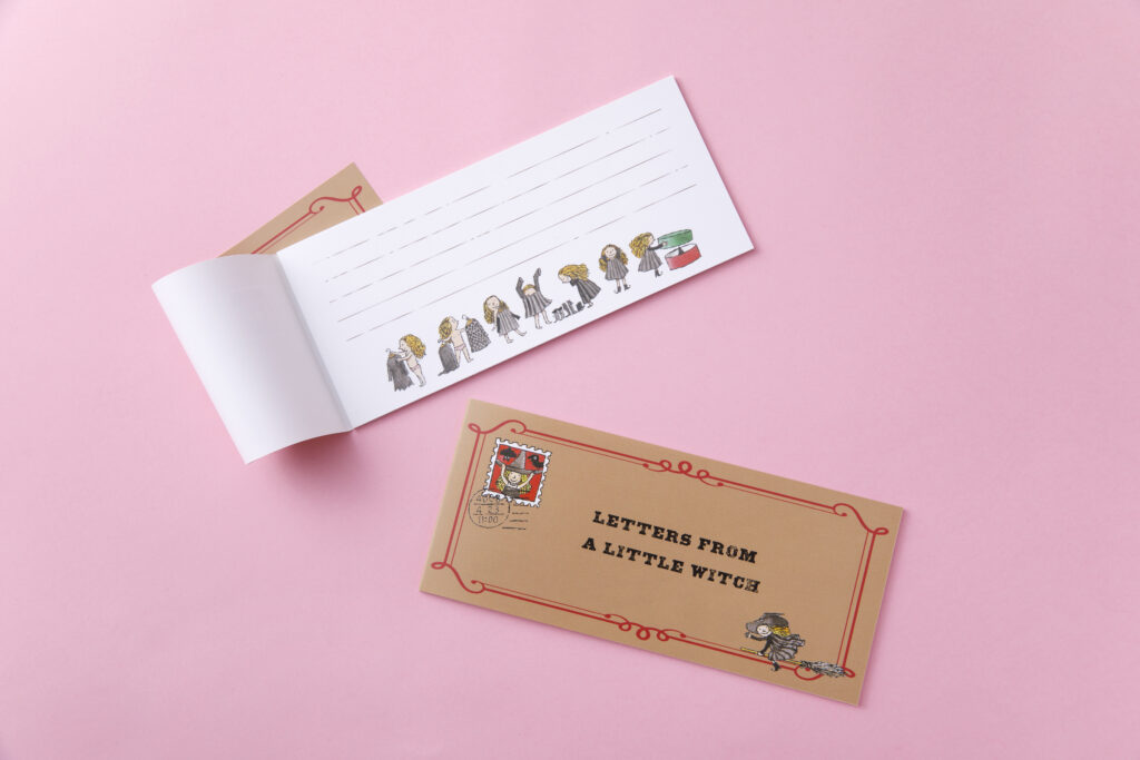 2025年12月22日から魔法の文学館(1階)ショップでは、第5回企画展「魔女からの手紙」関連グッズが並んでいます。2階ギャラリーで展示中の原画『ちいさな魔女からの手紙』角野栄子 作/ポプラ社(2008年発行)より、はたこうしろうさんのイラストを使用した文房具3商品。魔女に変身中の可愛い女の子のイラストがたくさん入っています。
